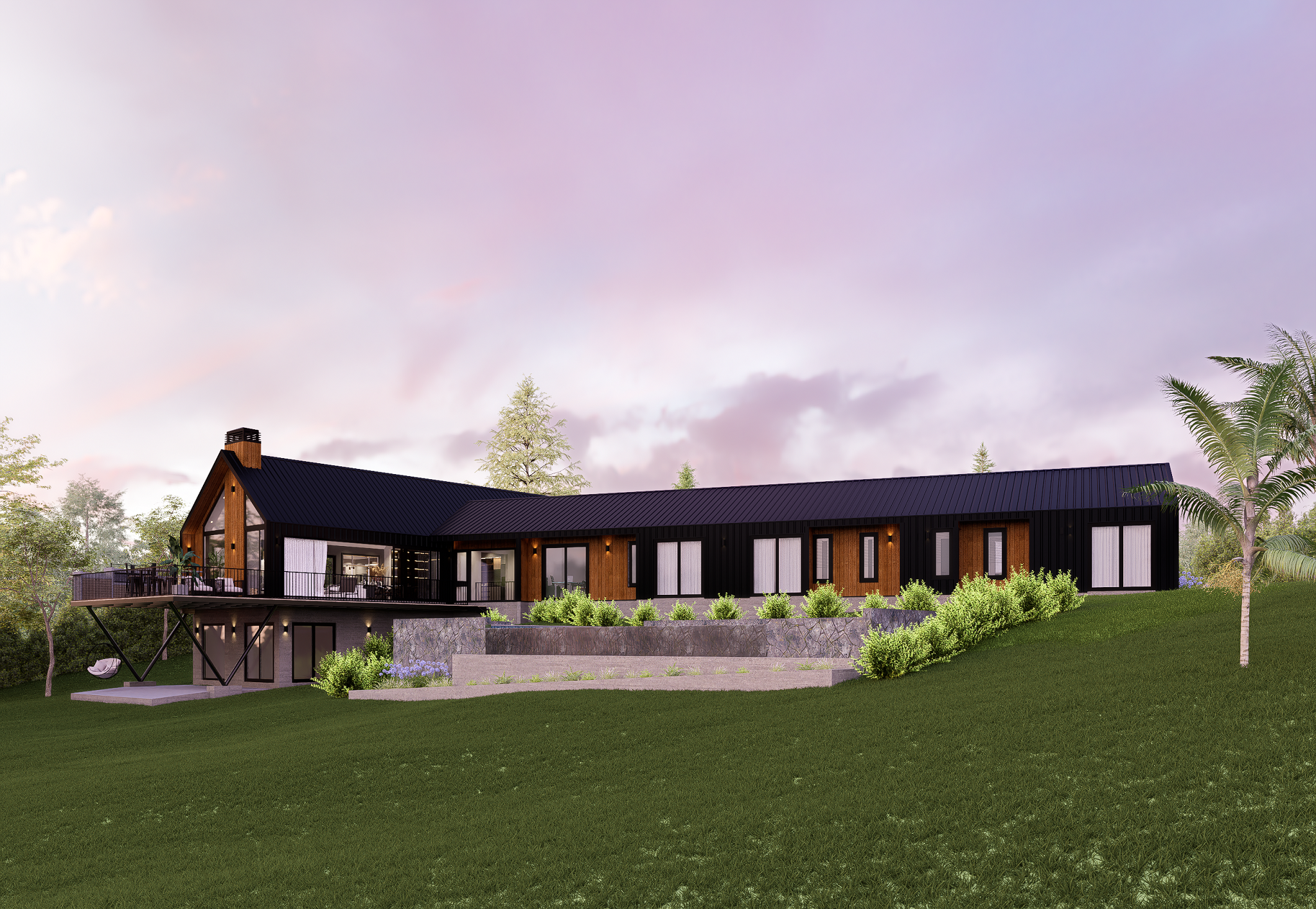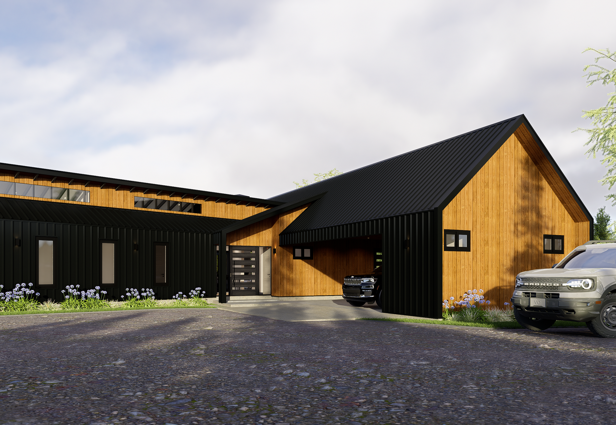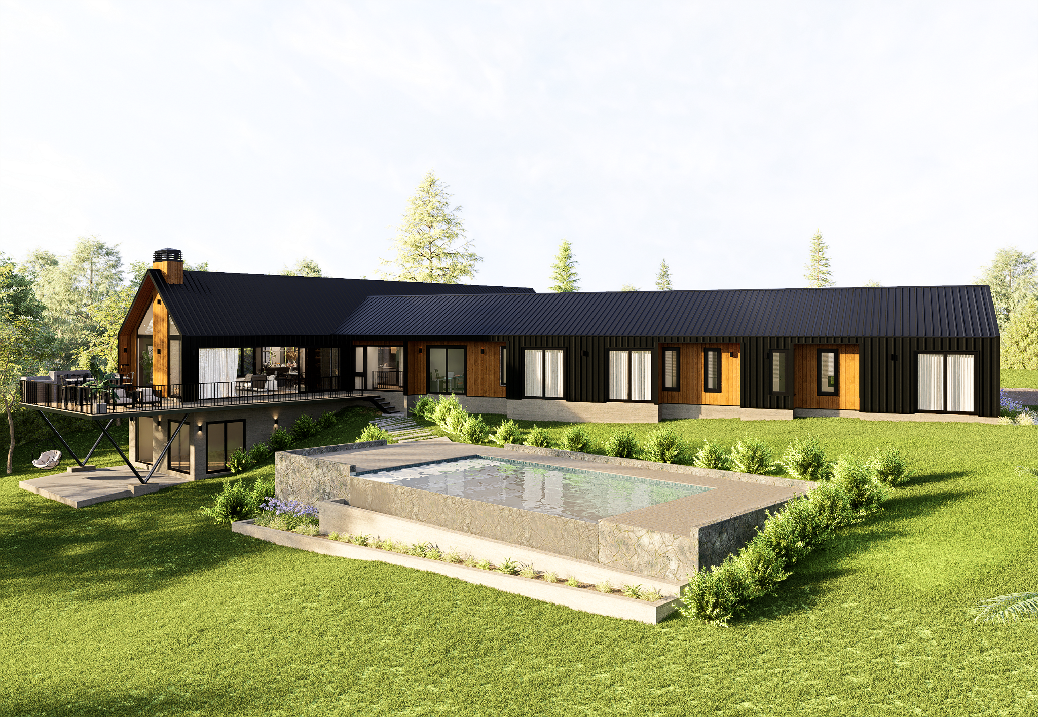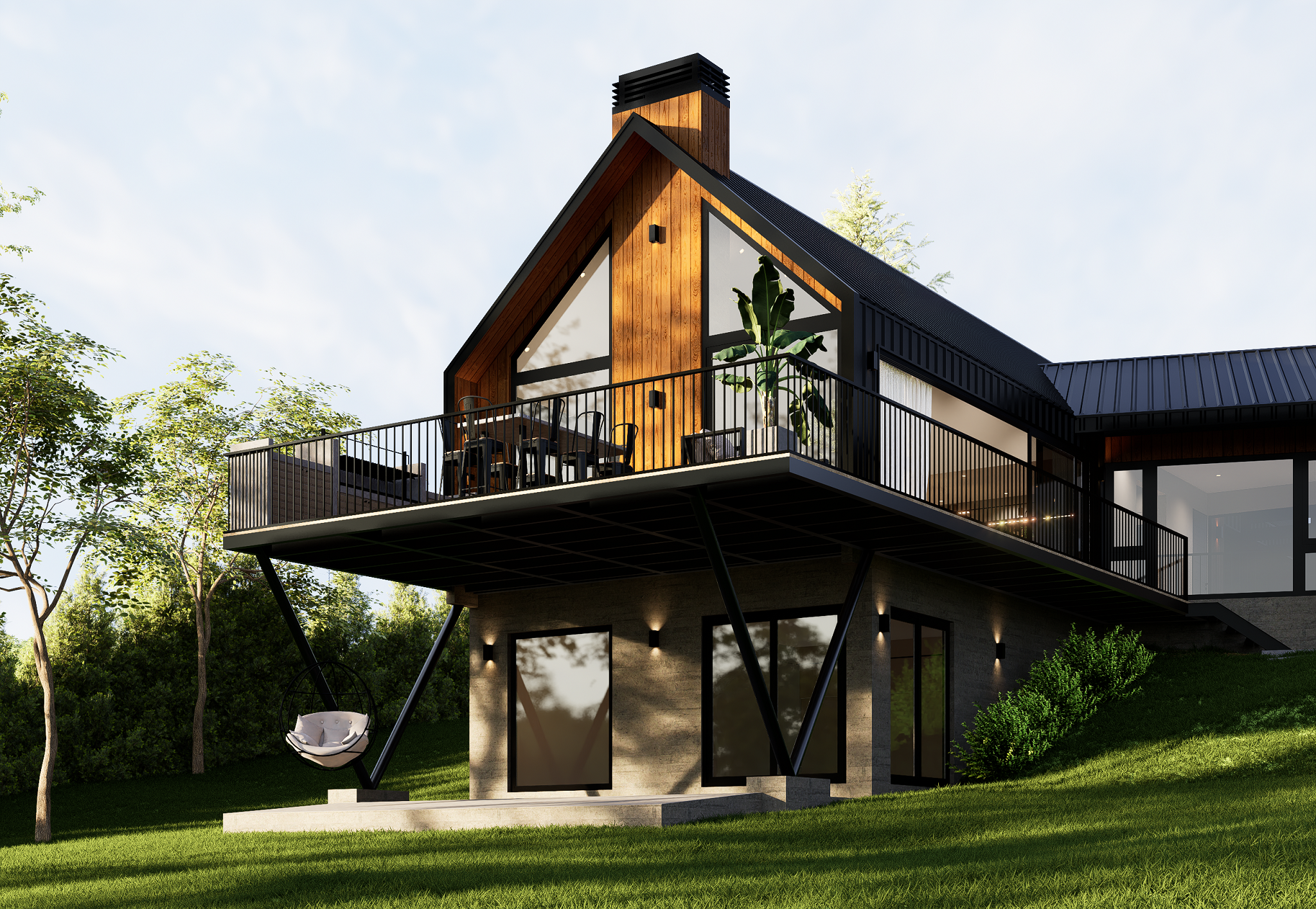 Este proyecto de aproximadamente 320 m² se emplaza en una pendiente, aprovechando la topografía natural del terreno para acentuar las vistas desde todos sus espacios interiores. Con un estilo de galpón contemporáneo, la vivienda combina revestimientos exteriores metálicos en color negro mate con la calidez de la madera, logrando un contraste elegante y atemporal. En el nivel principal se ubican tres dormitorios, cada uno con baño privado y walking clóset, además de una oficina y un hall de acceso que organiza y diferencia la vida privada de los espacios públicos. La zona social se desarrolla en un amplio ambiente integrado de living, comedor y cocina, acompañado de lavadero, estacionamiento, baño de visitas y un baño exterior.