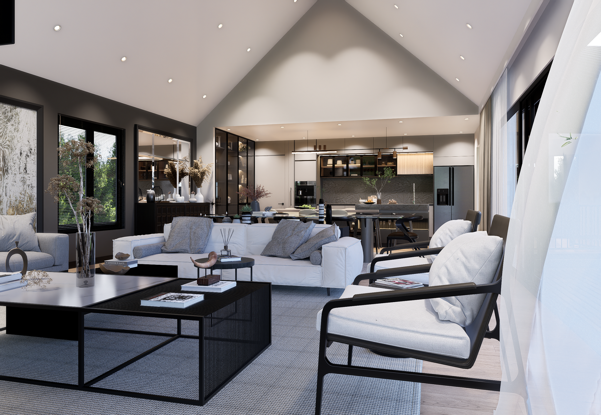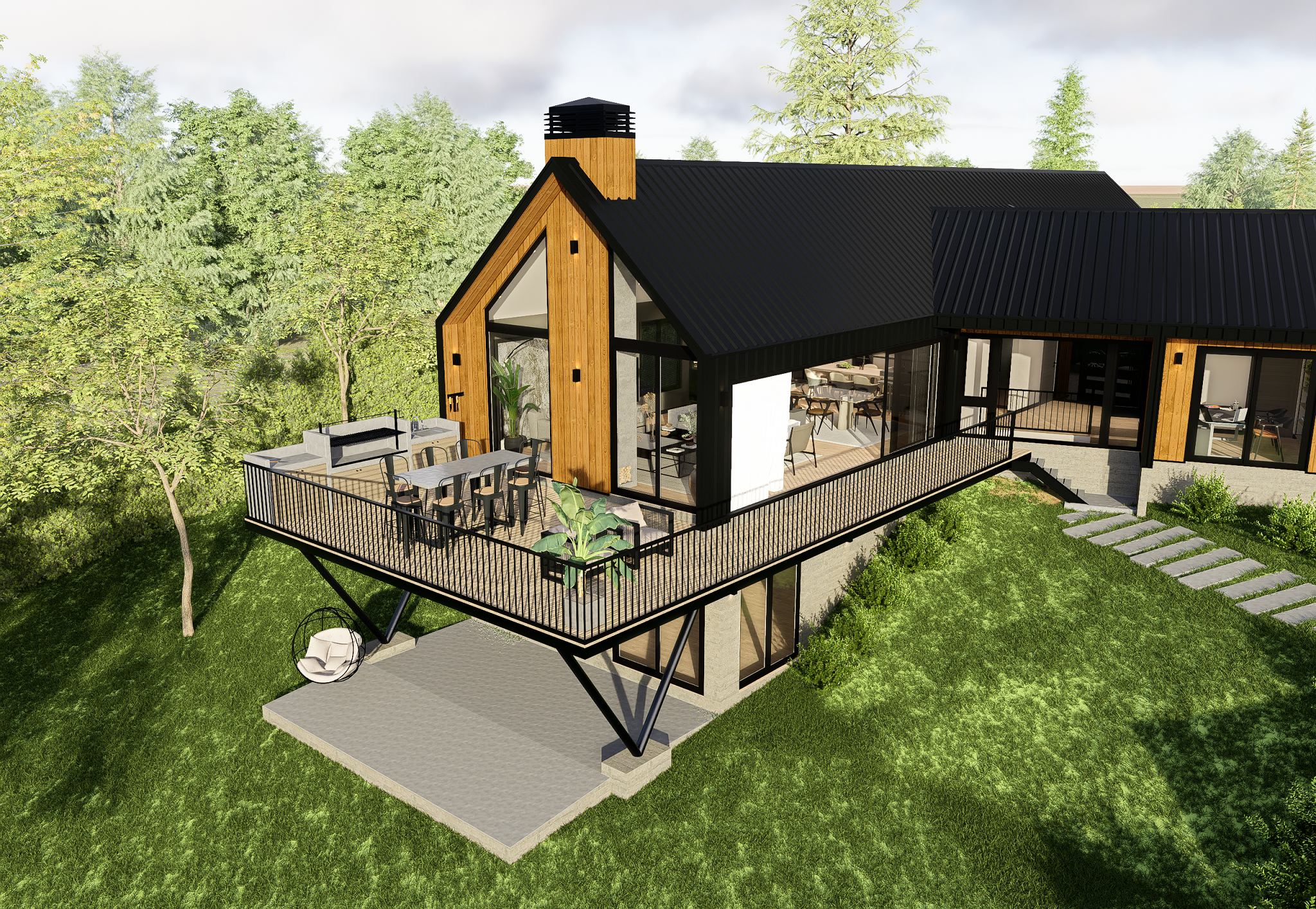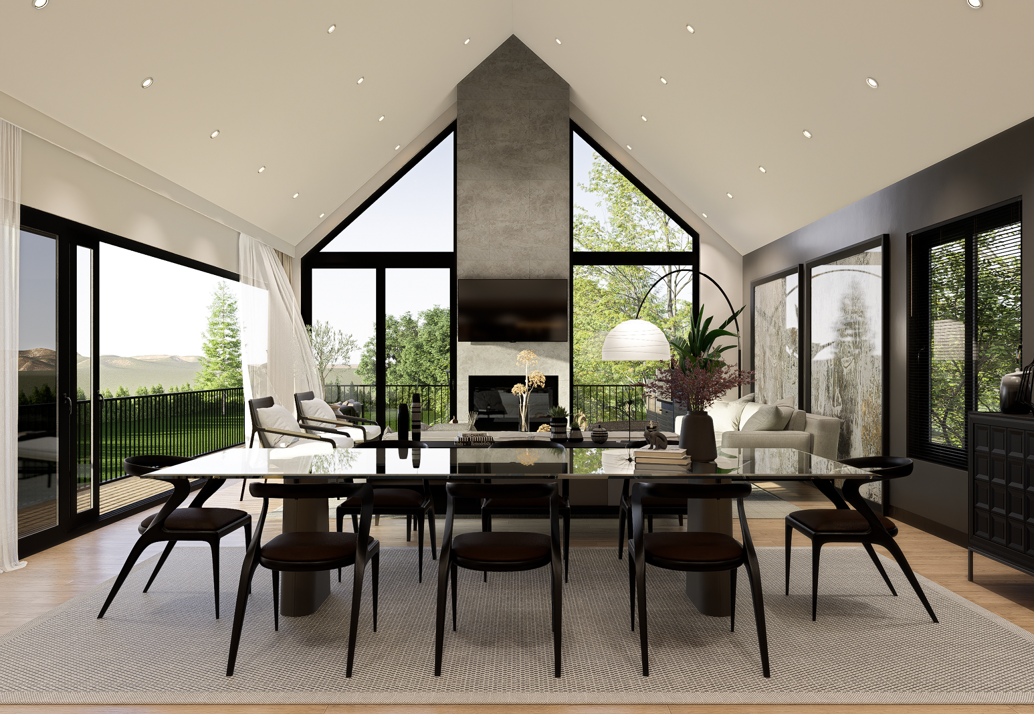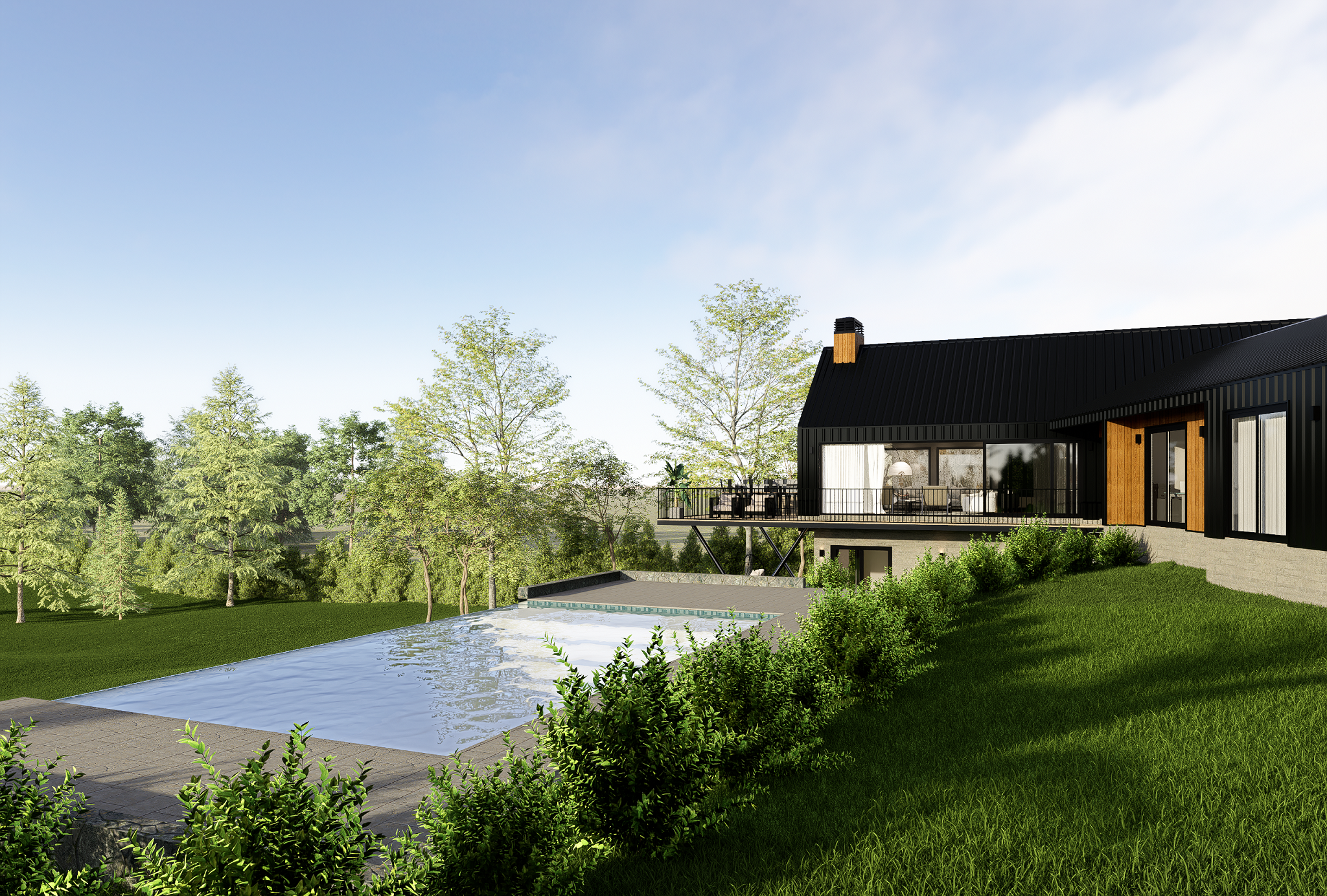 Este proyecto de aproximadamente 320 m² se emplaza en una pendiente, aprovechando la topografía natural del terreno para acentuar las vistas desde todos sus espacios interiores. Con un estilo de galpón contemporáneo, la vivienda combina revestimientos exteriores metálicos en color negro mate con la calidez de la madera, logrando un contraste elegante y atemporal. En el nivel principal se ubican tres dormitorios, cada uno con baño privado y walking clóset, además de una oficina y un hall de acceso que organiza y diferencia la vida privada de los espacios públicos. La zona social se desarrolla en un amplio ambiente integrado de living, comedor y cocina, acompañado de lavadero, estacionamiento, baño de visitas y un baño exterior.