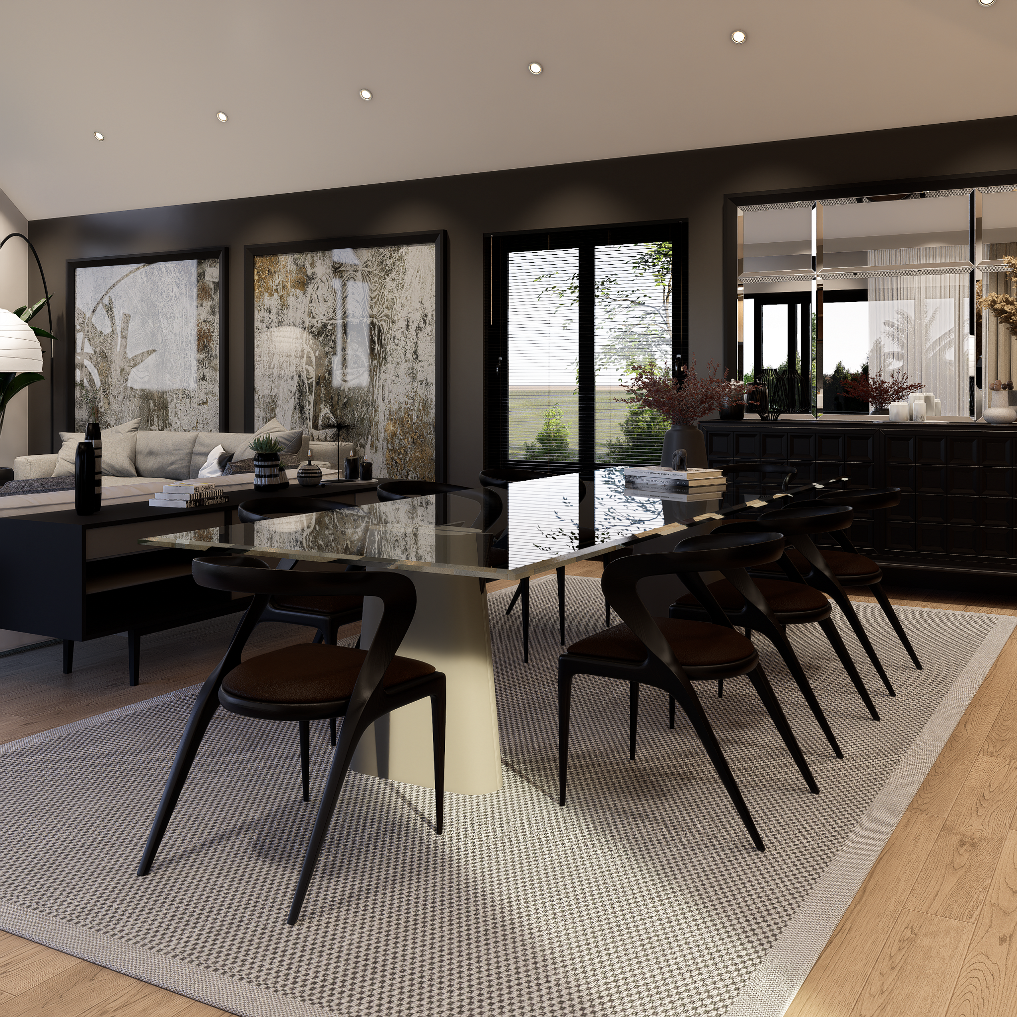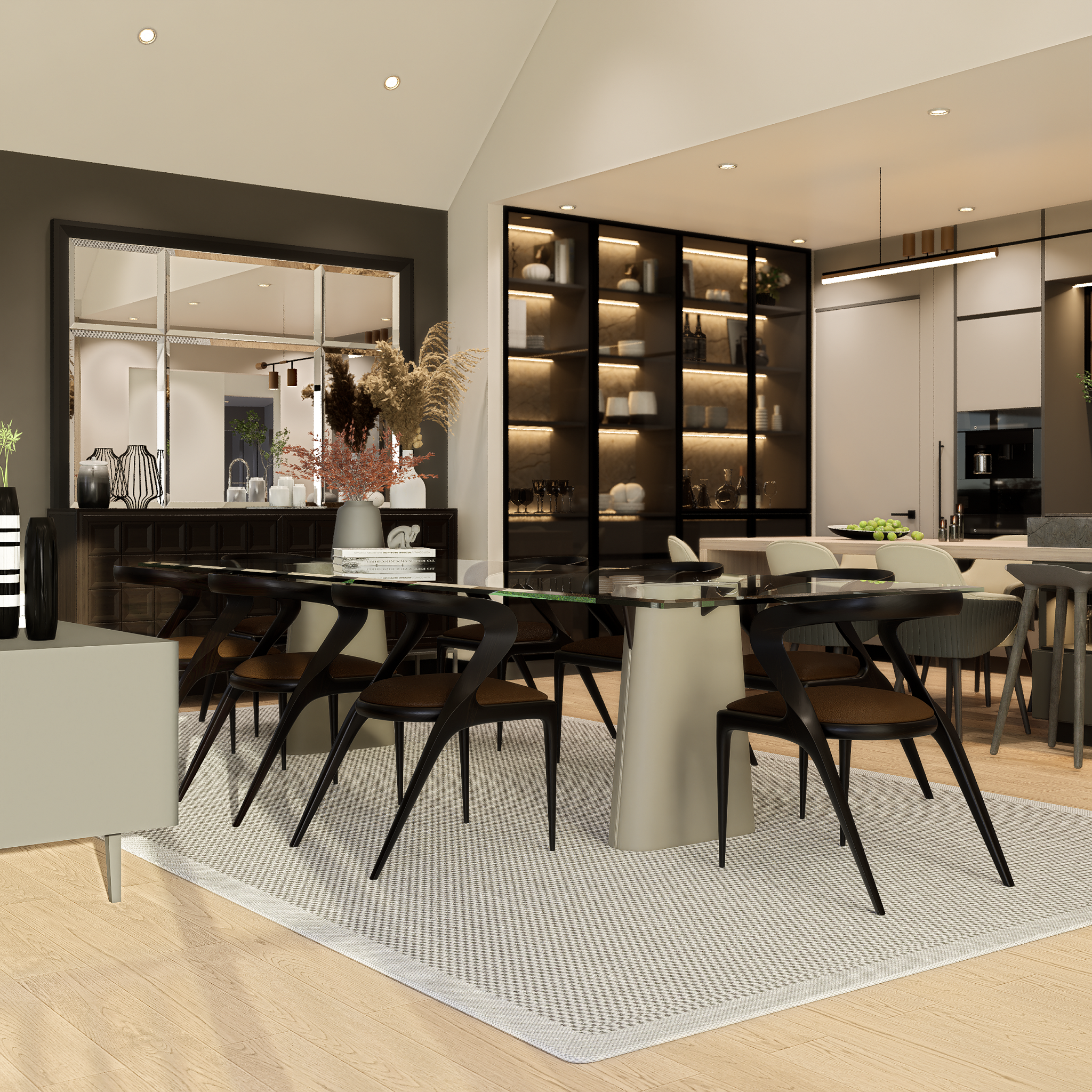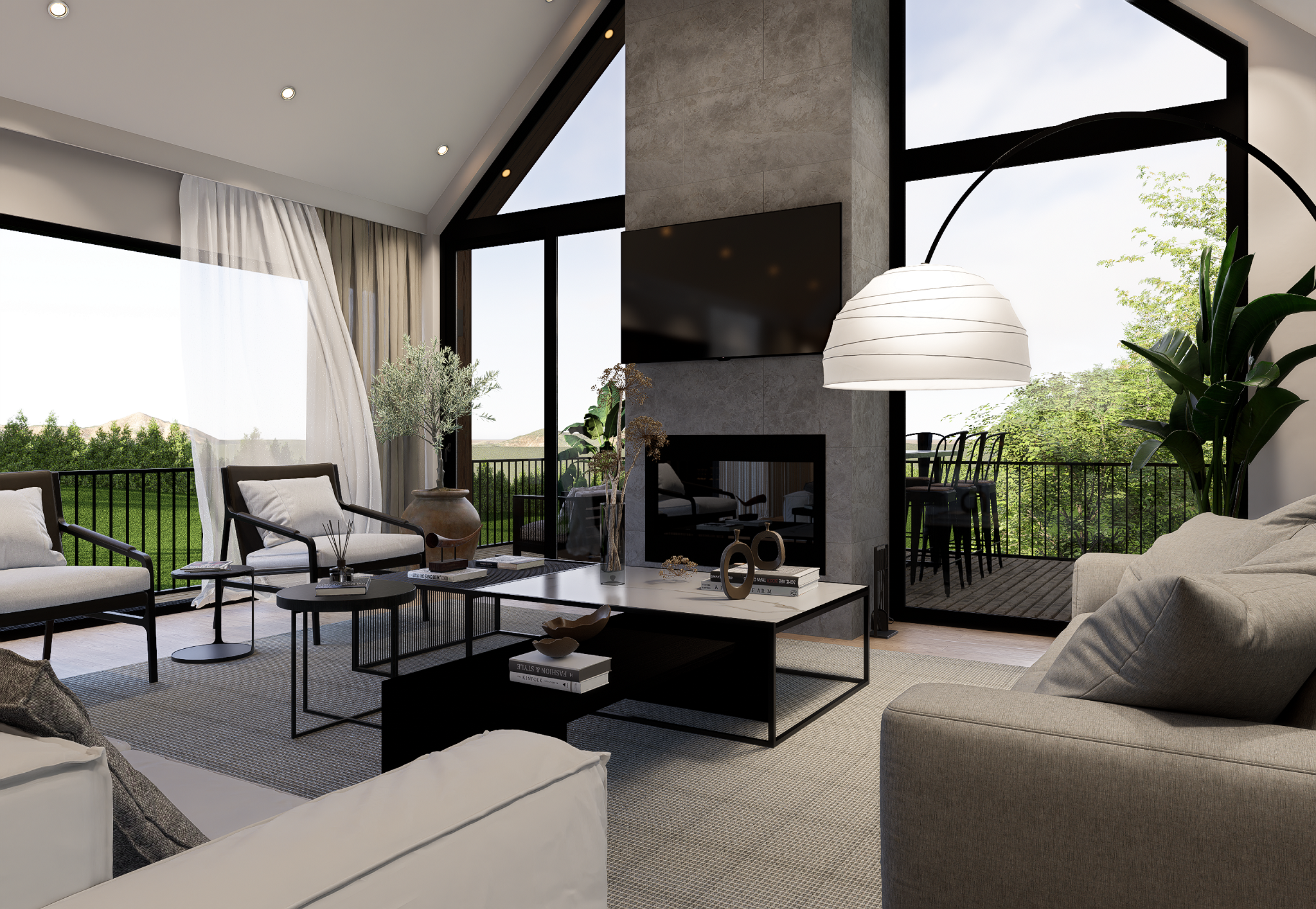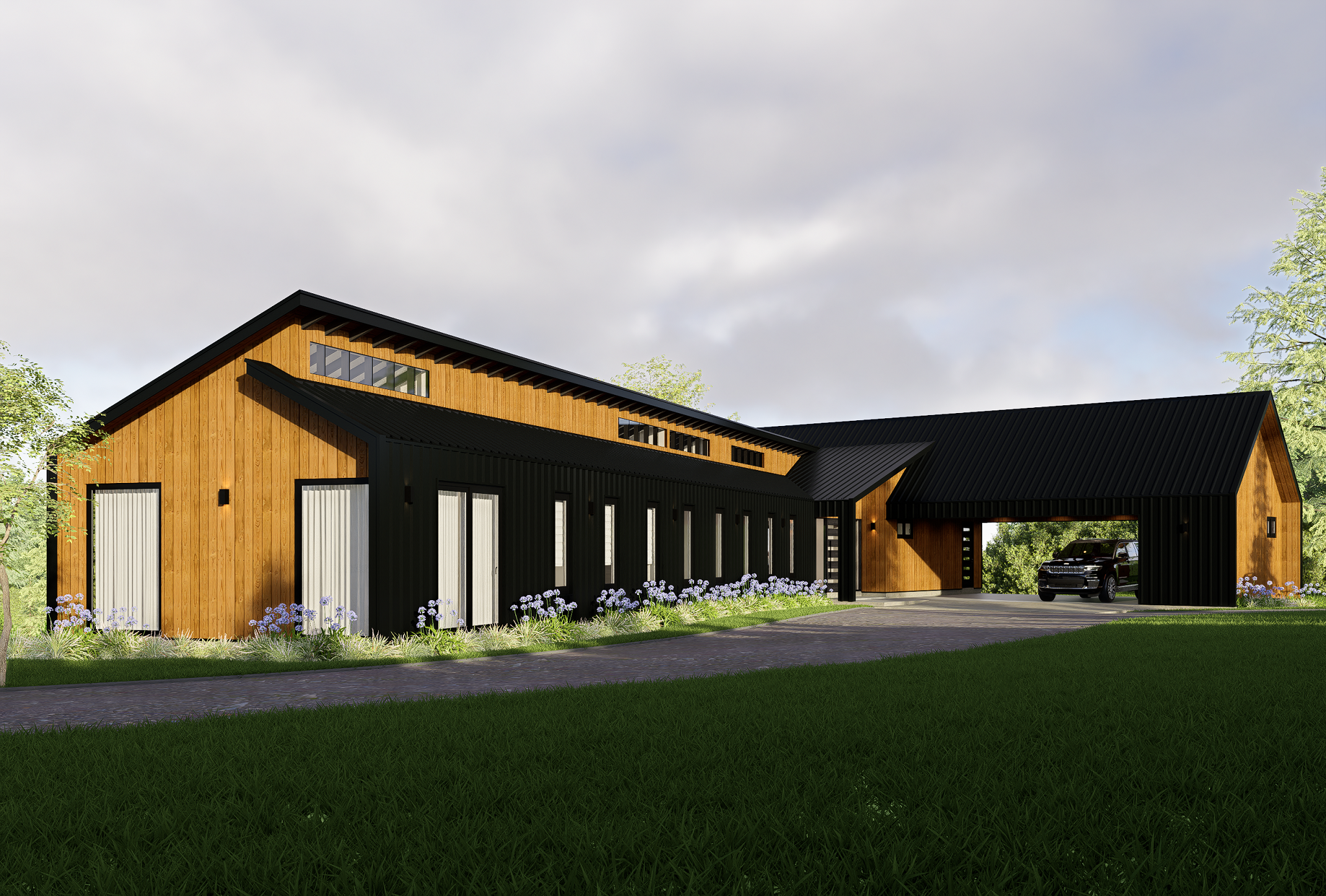 Este proyecto de aproximadamente 320 m² se emplaza en una pendiente, aprovechando la topografía natural del terreno para acentuar las vistas desde todos sus espacios interiores. Con un estilo de galpón contemporáneo, la vivienda combina revestimientos exteriores metálicos en color negro mate con la calidez de la madera, logrando un contraste elegante y atemporal. En el nivel principal se ubican tres dormitorios, cada uno con baño privado y walking clóset, además de una oficina y un hall de acceso que organiza y diferencia la vida privada de los espacios públicos. La zona social se desarrolla en un amplio ambiente integrado de living, comedor y cocina, acompañado de lavadero, estacionamiento, baño de visitas y un baño exterior.